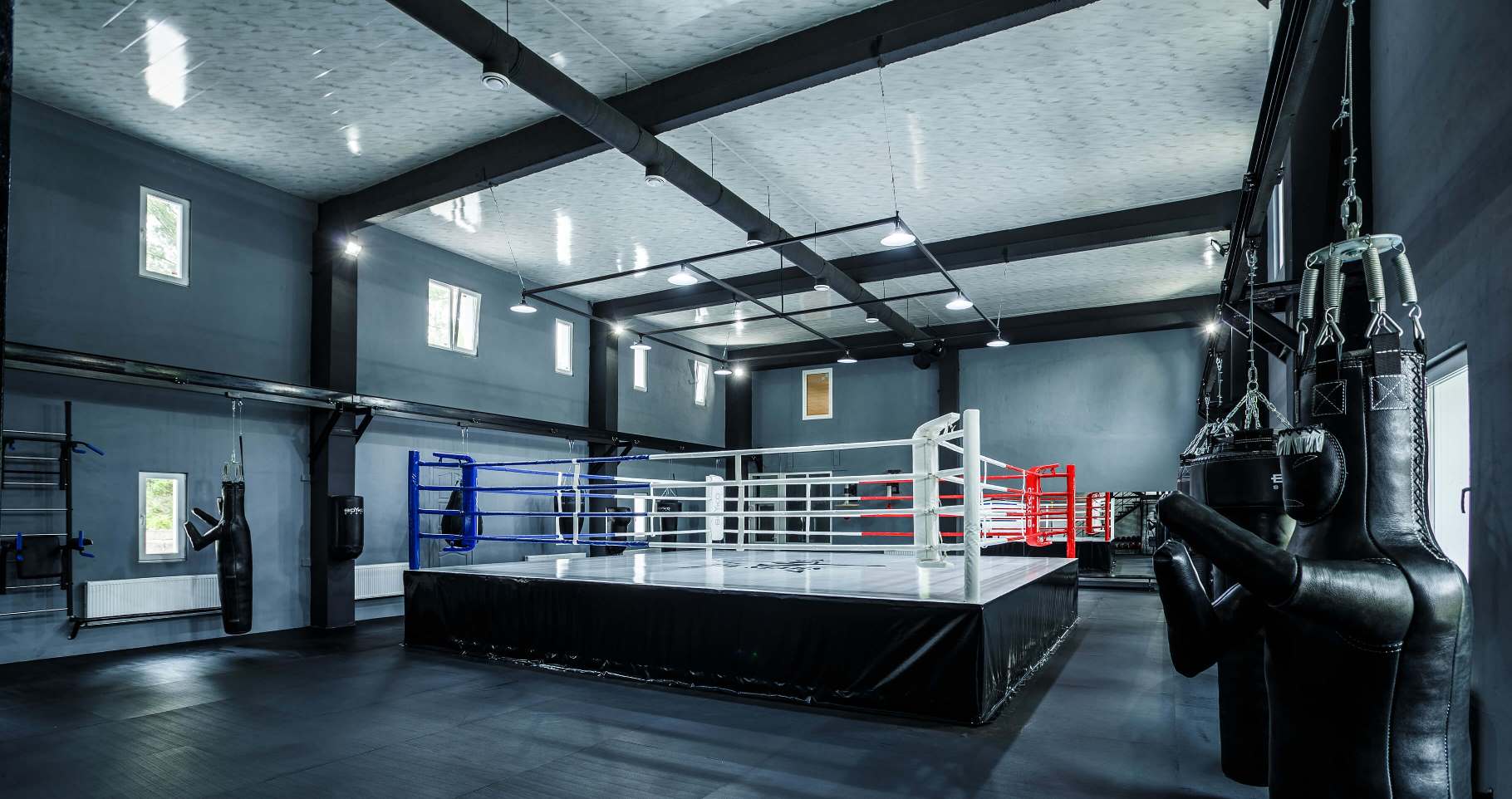 Зал укомплектован высококачественным профессиональным оборудованием - груши, мешки, боксерский ринг, весь необходимый инвентарь, зона TRX.